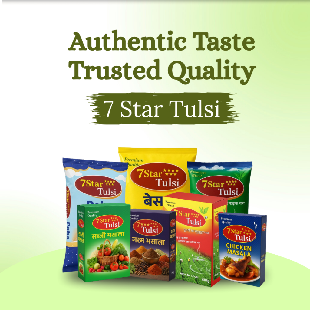7 Star Tulsi is one of India’s leading premium brands, committed to delivering pure, high-quality food products you can trust. We take pride in offering a wide range of hygienically processed and carefully curated food items, including Rawa, Maida, Besan, Garam Masala, Poha, and many more. At 7 Star Tulsi, our dedication to purity, taste, and quality ensures that every product adds value and flavor to your kitchen. Choose 7 Star Tulsi; where purity meets perfection.